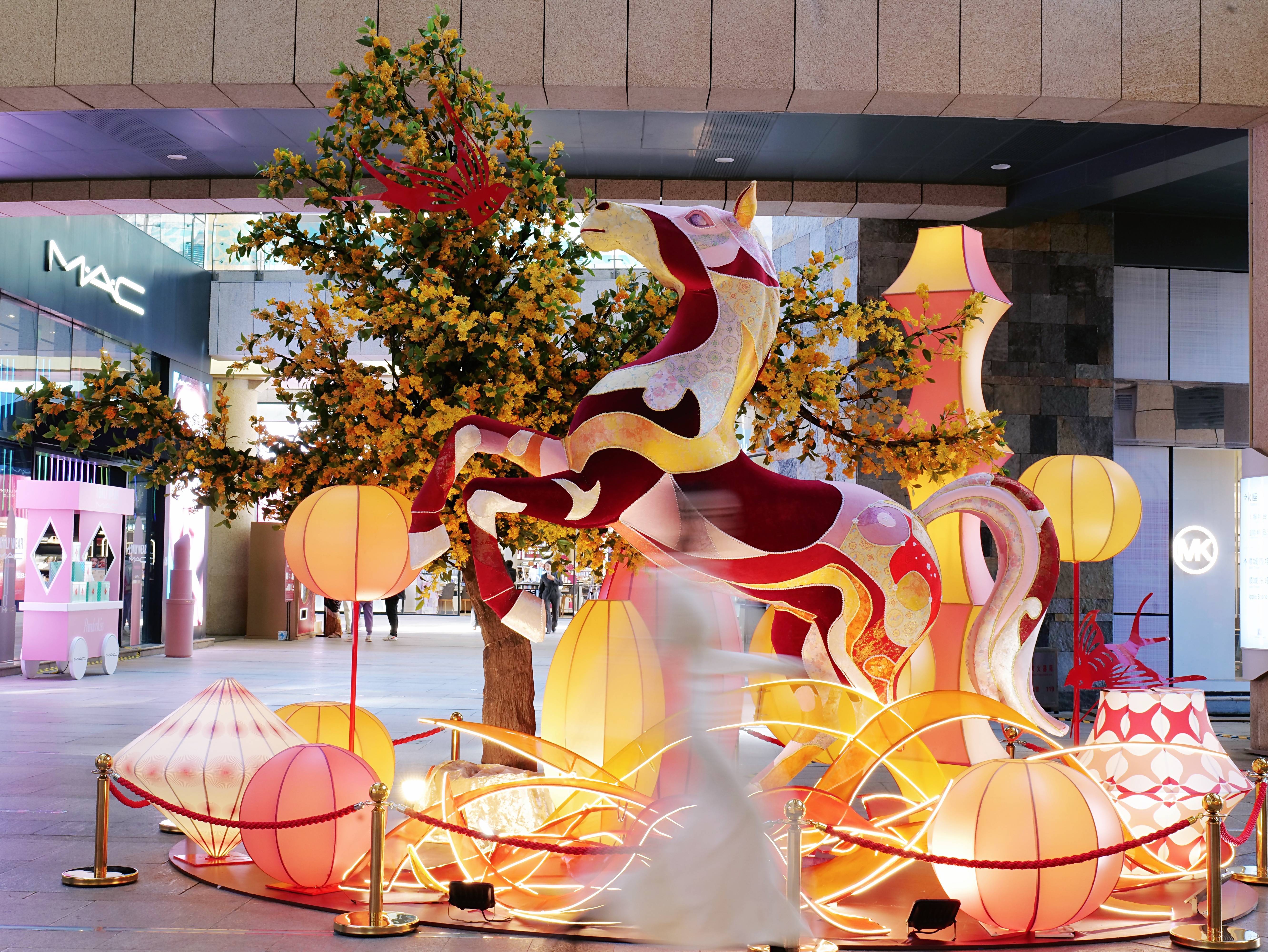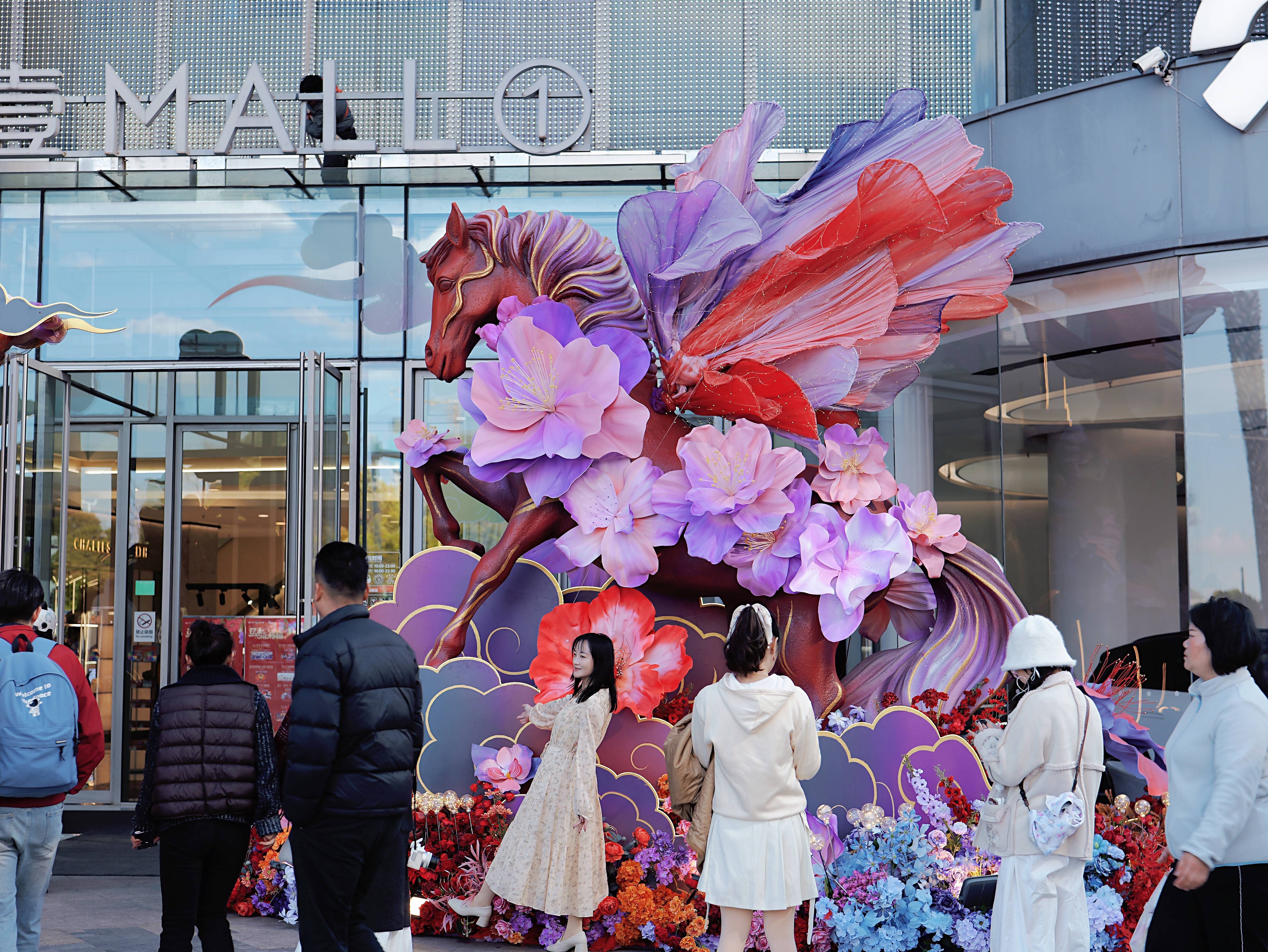 昆明一家百货大楼前的“马上转运”装置。新华社发据介绍,这些艺术装置以生肖马为情感载体,将非遗技艺、本土符号和特色产业融入艺术创作,不仅渲染了新春氛围,更成为带动商圈人流、激活文旅消费的重要动力。