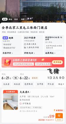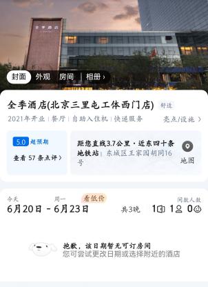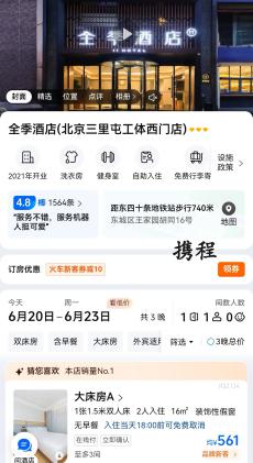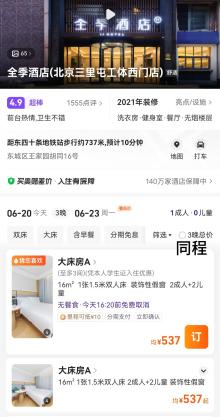 至于华住集团的全季酒店,北京南锣鼓巷安定门地铁站店的高级大床房A中,京东旅行凭借463元的价格成为行业最低。然而,在全季酒店北京三里屯工体西门店,同程、飞猪、携程等OTA均有报价且房源充足的情况下,京东旅行并没有相应报价,这里已经暴露出京东旅行背后供应链不足的问题。