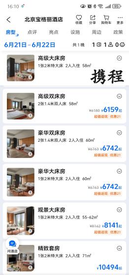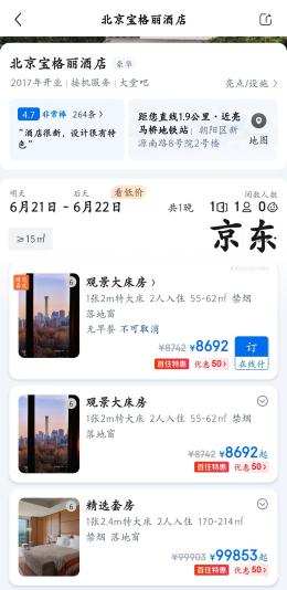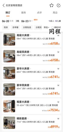 而榜单前五中唯一有房型报价的北京宝格丽酒店,情况也不容乐观。点击即可发现,在6月20日当天,京东旅行无房型可订,反观其他OTA平台均正常提供预订服务。再查询6月21—22日,京东旅行仅展示两种房型,观景大床房报价为8692元,精选套房更是高达99853元。与之对比,携程当天拥有12种房型,且观景大床房价格为8141元,精选套房价格在93259元;飞猪上架10种房型,观景大床房8162元,精选套房约为93280元;同程的观景大床房价格更是低至7534元,比京东旅行便宜超千元。因此,即便宝格丽酒店在京东旅行上架,无论是房型的丰富度还是价格的竞争力,都远不及其他OTA平台。